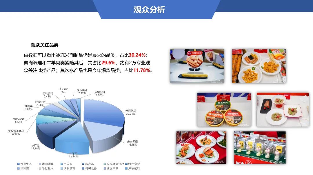 覆盖速冻米面、火锅料、速冻肉制品、速冻水产、预制菜、火锅食材、冰淇淋、调味料及相关配料、原辅料及设备、工装、包装材料等,涉及研发、检测、生产、产品供应及冷链配送等全产业链,新品爆品云集,集中展示行业整体现状与细分领域发展机遇,助力冷冻食品及餐饮食材产业满足不同场景和人群新需求创新发展,全方位推动渠道资源对接更精准、更高效。