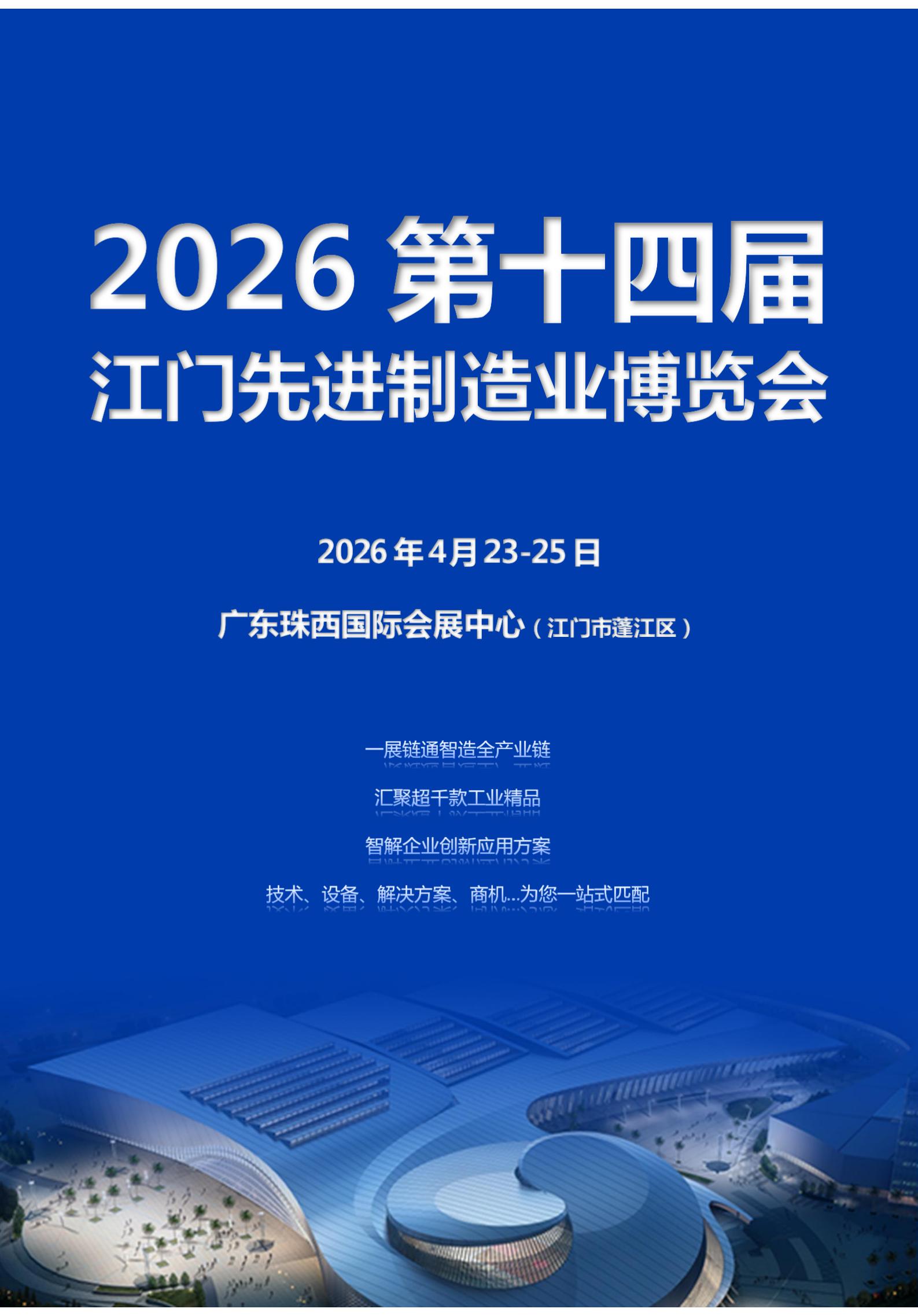 2026第十四届江门先进制造业博览会应时而启,定于2026年4月23-25日在广东珠西国际会展中心(江门市蓬江区)举行。本届展会将紧扣“先进制造·引领未来”主题,以产业数智化转型与技术创新为核心引擎,全力构建一个集产品展示、技术交流与产业合作为一体的高端平台。